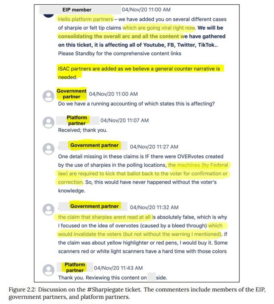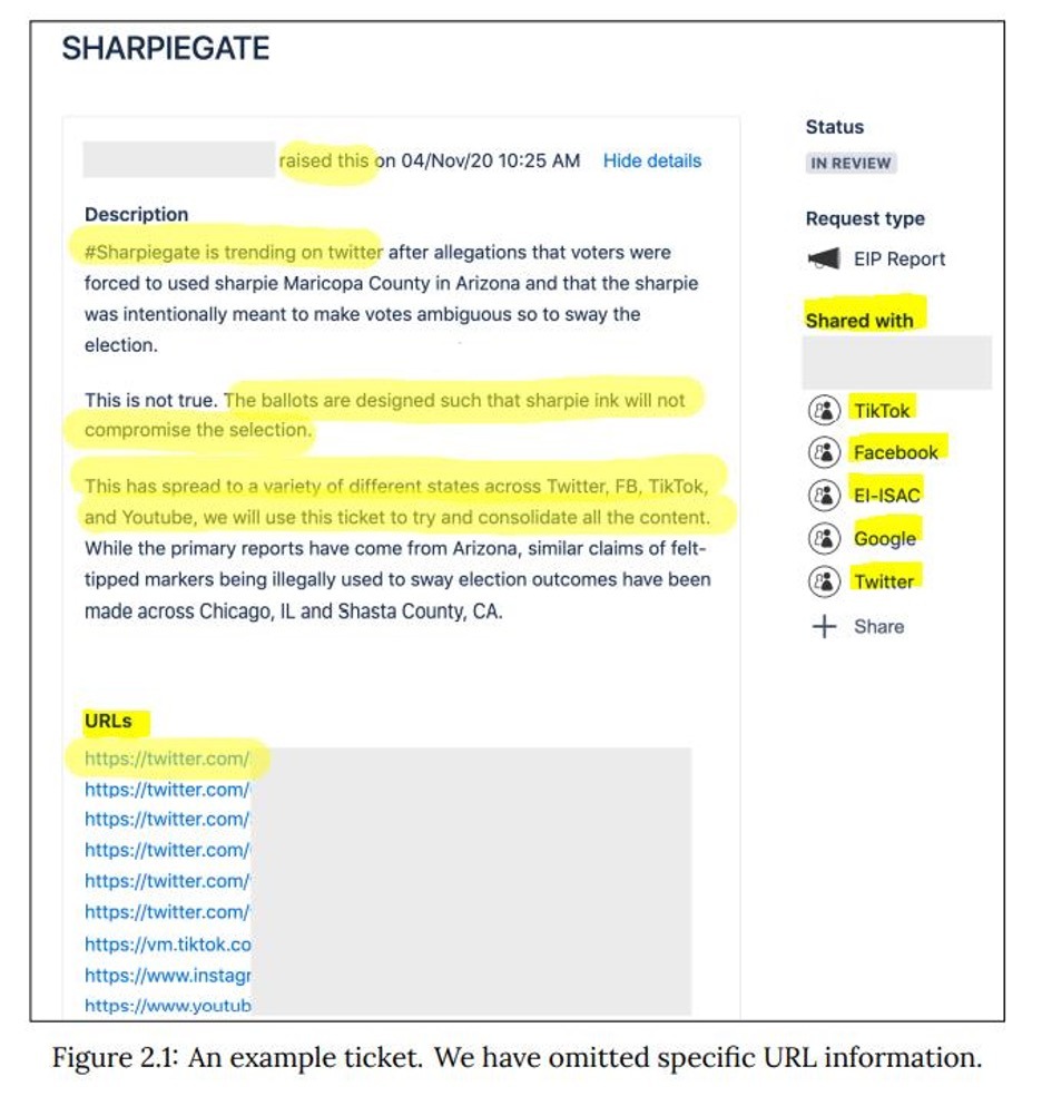 Below, you’ll see DHS, EIP and social media companies all on a shared real-time chat app (Jira Service Desk) to coordinate speech takedowns all as a single, seamless unit. Below are two sample screenshots EIP provided in their own report for the example of their work to censor posts sharing the 2020 election #Sharpiegate narrative, which concerned alleged voting irregularities related to the use of overbleed markers.