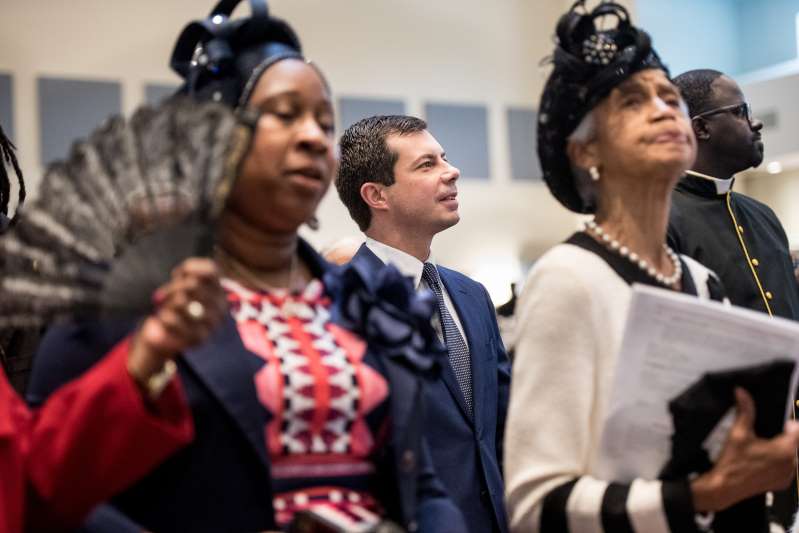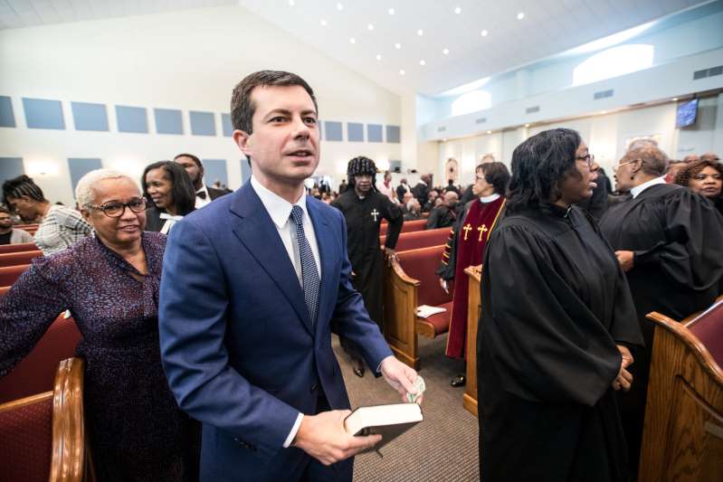 © Sean Rayford/Getty Images North America/TNS Democratic presidential candidate, South Bend, Indiana Mayor Pete Buttigieg exits a church pew during Sunday service at the Kenneth Moore Transformation Center October 27, 2019 in Rock Hill, South Carolina.