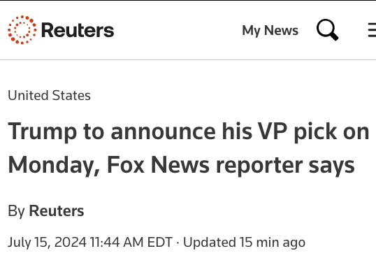 https://www.reuters.com/world/us/trump-announce-his-vp-pick-monday-fox-news-reporter-says-2024-07-15/
