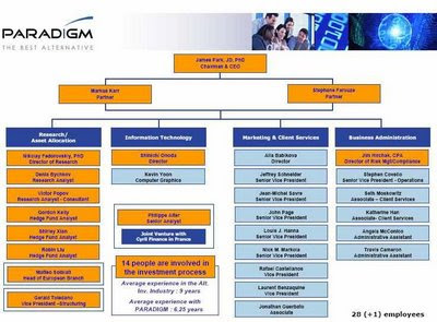 Paradigm claimed as recently as 2006 in marketing documents that it had over $1.5 billion under management and 28 full time staff as well as offices in New York, Monte Carlo and Tokyo. Now (according to its IARD filing) it has about 300 million in 210 discretionary accounts and 6-10 employees. There are no offshore offices.