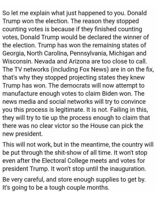 The Fix is in and we need the Supreme Court to rule. That whole mailing out unsolicited ballots probably to just the Democratic Data Base was a tactical ploy to steal the election. It is working just the way Trump said I’d would. All remaining ballots that should have been checked in and counted before Election night are riddled with fraud have absolutely no way of verifying that the registered voter even filed the ballot out.