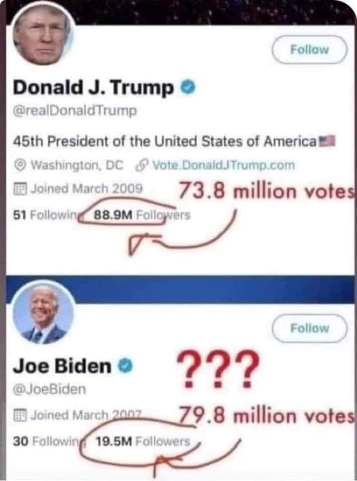 Here’s the best evidence yet that Trump got the 80 MILLION votes and Biden really got squat! SEND THIS GRAPHIC OUT EVERYWHERE.