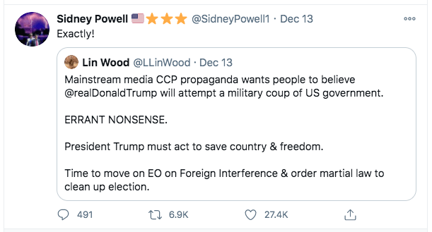 — Sidney Powell 🇺🇸⭐⭐⭐ (@SidneyPowell1) December 14, 2020