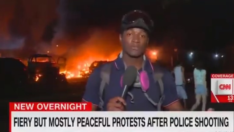 As he spoke, buildings and vehicles burned in the background, with the scenes of destruction and chaos running contrary to what the network captioned as “fiery, but mostly peaceful protests after police shooting.”