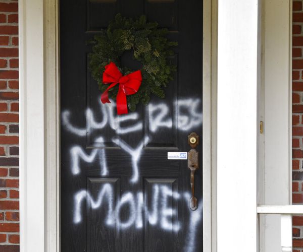 Messages were written on the home using red and white spray paint, including “Where’s my money?”