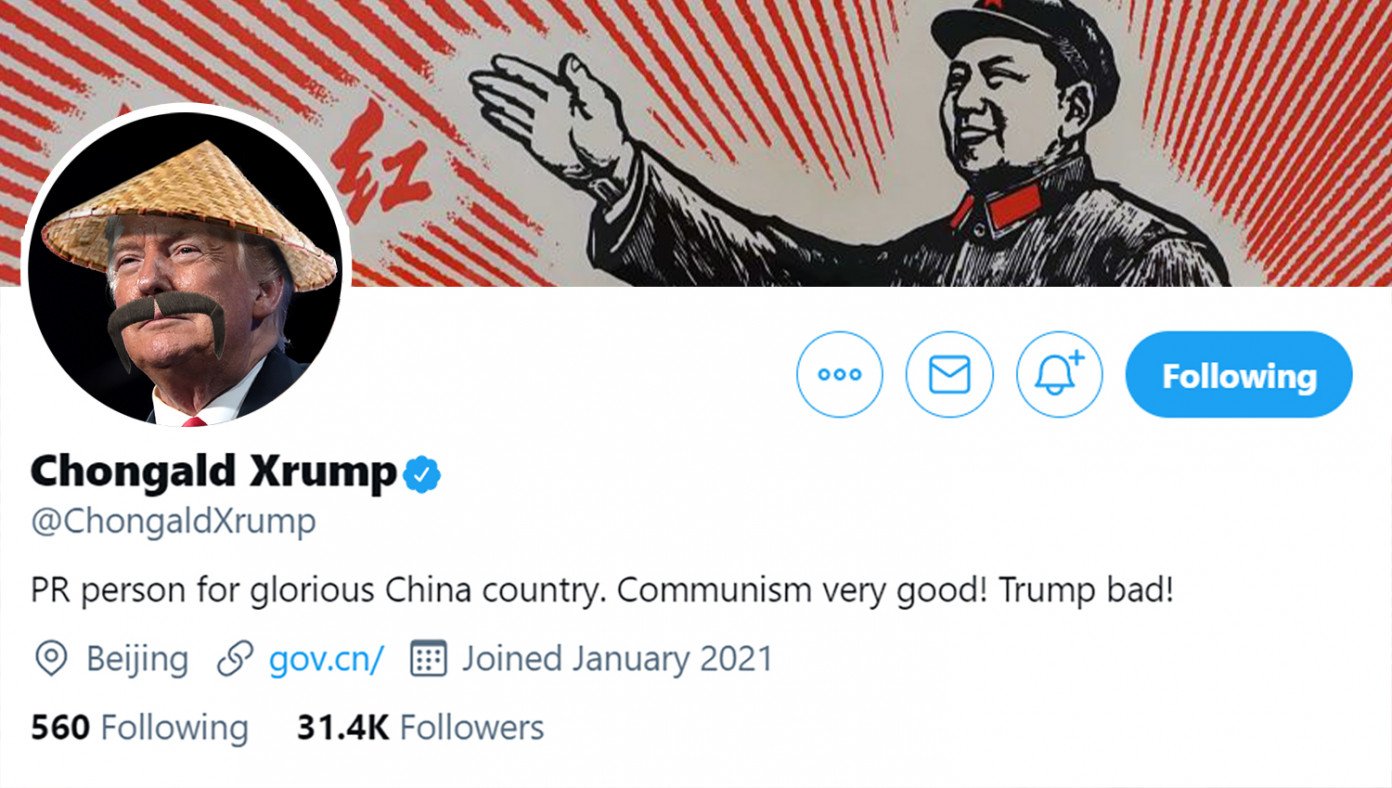 But the ever-clever Trump, always known as the smartest man in the room, has managed to get back on the social network by disguising himself as one Chongald Xrump, PR specialist for the Chinese Communist Party.