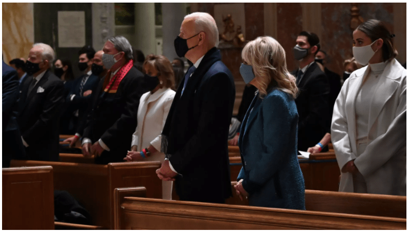 President Biden and First Lady Jill Biden attend Mass at the Cathedral of St. Matthew the Apostle in Washington, DC, on Jan. 20. Photo: Jim Watson/AFP via Getty Images