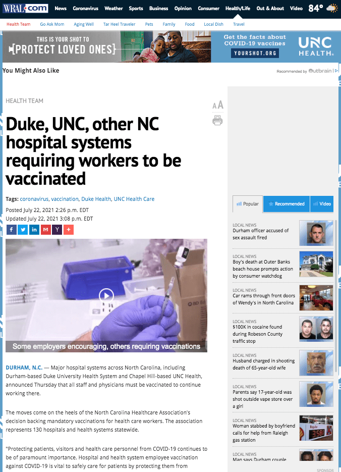 ___ https://www.wral.com/coronavirus/duke-unc-other-nc-hospital-systems-requiring-workers-to-be-vaccinated/19784704/