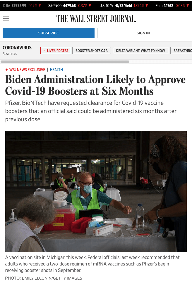 https://www.wsj.com/articles/biden-administration-plans-covid-19-vaccine-boosters-at-six-months-instead-of-eight-11629919356