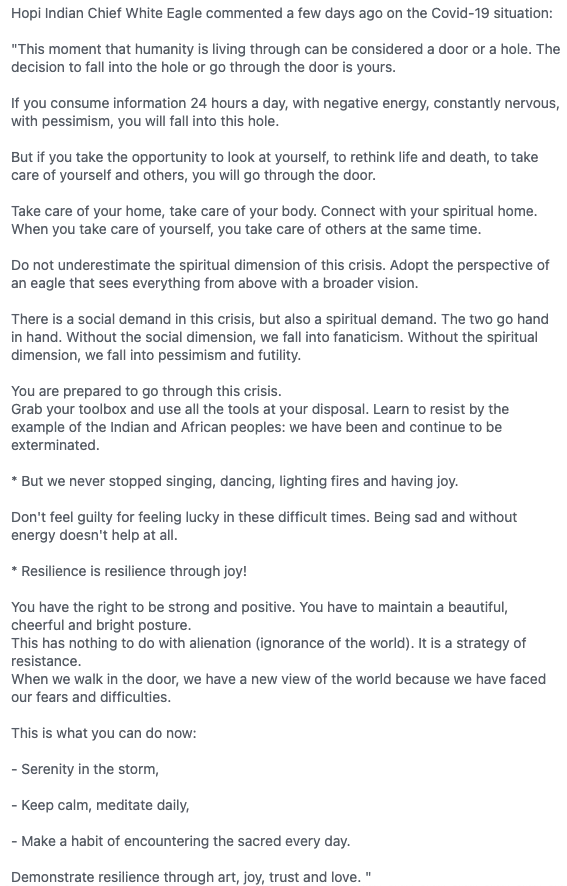 You were prepared to go through this crisis. Take your toolbox and use all the tools at your disposal. Learn about resistance with indigenous and African peoples: we have always been and continue to be exterminated.