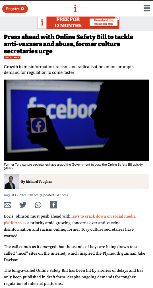 Press ahead with Online Safety Bill to tackle anti-vaxxers and abuse, former culture secretaries urge