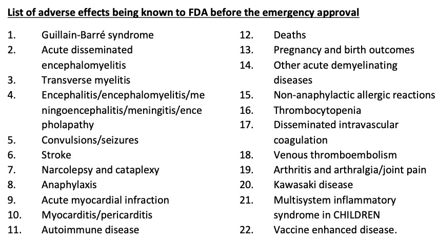 And these are just some of the adverse Covid vaccine side effects which were known BEORE THE FDA’S EMERGENCY APPROVAL!