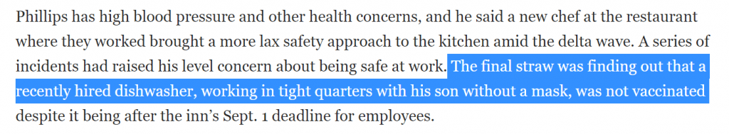 Let me be clear from the start: I do not know the degree to which vaccine mandates have played a role in the massive voluntary exodus from the workforce. I do, however, know that any true journalist would at least entertain the possibility that the two are correlated. Finding such a journalist proved to be a difficult task: ABC, CNN, CBS, Washington Post, Reuters, CNBC, The Atlantic, WSJ, NYT, The Hill, Business Insider, Fortune, FT, Vox, Market Watch, and even right-wing publishers like NY Post and Fox Business have all covered the mass resignations without so much as a mention of vaccine mandates. The WaPo, citing a single anecdote, went so far as to suggest that unvaccinated workers are causing others to quit by making them feel unsafe: