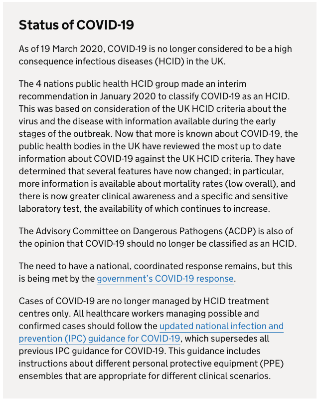 Read the official UK government guidance at: https://www.gov.uk/guidance/high-consequence-infectious-diseases-hcid?fbclid=IwAR0VTwze8V8AORcSTAiBHZjw502Qav36yg-5WtGPazMuyL4YeEpGrGXzmdY#status-of-covid-19