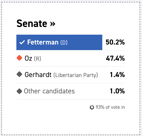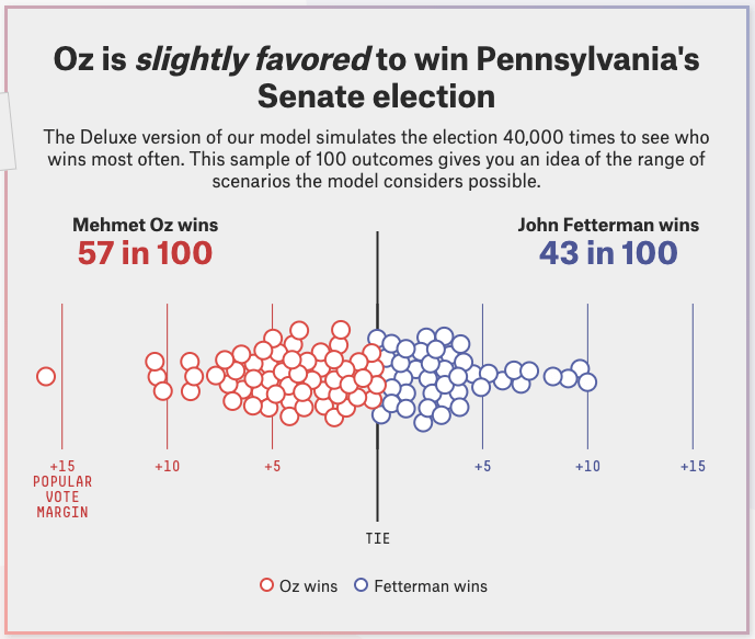 Here’s the latest polling prediction published by FiveThirtyEight on November 8, 2022, and yet Fetterman is supposedly ahead 50.2 to 47.4.