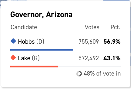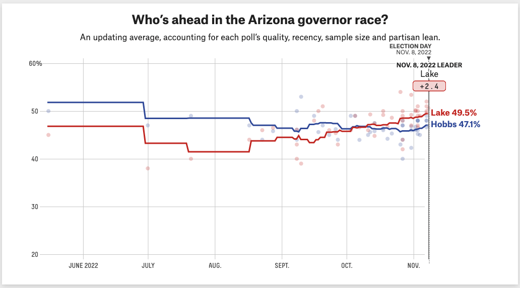 STEAL ALERT! FiveThirtyEight showed Kari Lake ahead in the polls on Nov. 8 by 2.5 points, yet look at the vote stats on Election Day late Tuesday night!!!.