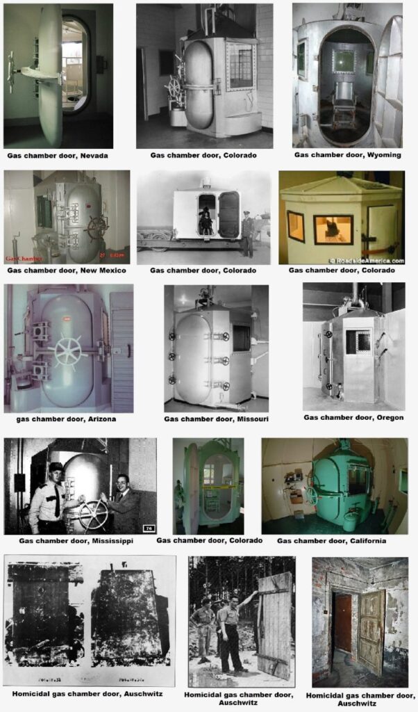 For example, Douglas Christie showed Zündel a picture of the alleged gas chamber at Auschwitz I, with its flimsy door leading into the gas chamber. Christie then showed Zündel a picture of an American gas chamber used to kill people, with its massive hinges and airtight seal of the gas chamber. Christie asked Zündel, “What is the purpose in comparison of those items?” Zündel replied: