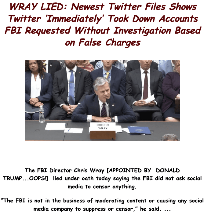 WRAY LIED: Newest Twitter Files Shows Twitter ‘Immediately’ Took Down Accounts FBI Requested Without Investigation Based on False Charges