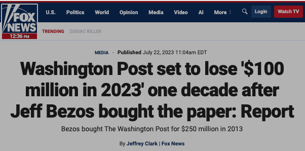 https://www.foxnews.com/media/washington-post-lose-100-million-2023-one-decade-after-jeff-bezos-bought-paper-report