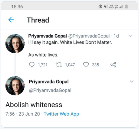 '@Cambridge_Uni lecturer @PriyamvadaGopal says "White Lives Don't Matter" and "Abolish Whiteness"