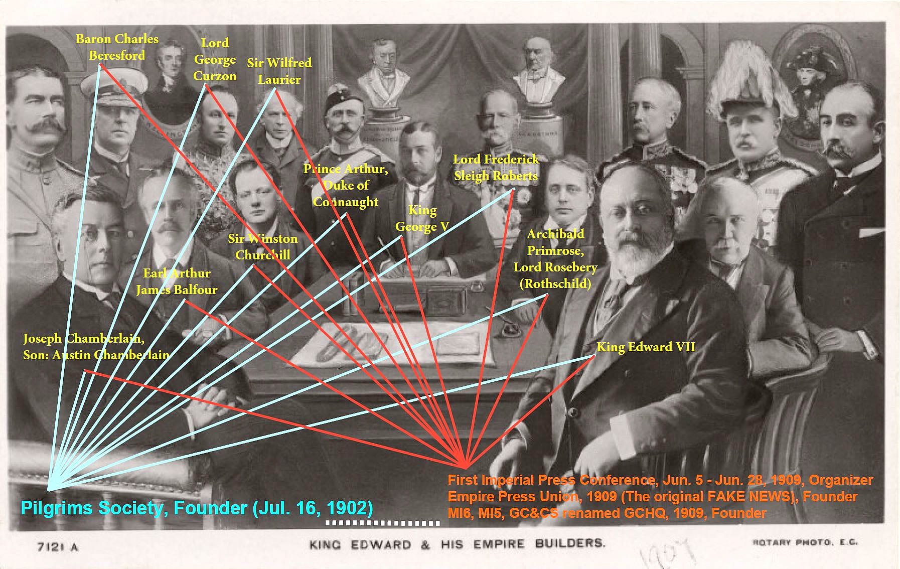 Had Cecil Rhodes and Lord Pirbright (Henry De Worms Rothschild) lived (they died in 1902 and 1903 respectively), they would certainly have been featured prominently in this sitting. Their disciples included Lord General Frederick Sleigh Roberts (the butcher of the Transvaal, 2nd Boer War), Earl Arthur James Balfour (conspirator in Zionism with Lord Rothschild and the “Balfour Declaration”), Joseph Chamberlain, Sir Winston Churchill, Lord George Curzon, King Edward VII, Archibald Primrose Lord Rosebery (inheritor of the N.M. Rothschild estate), among others.