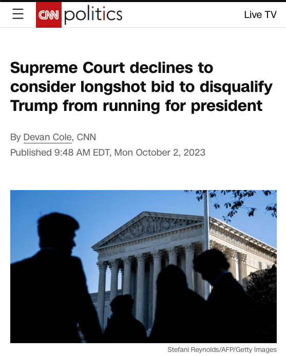 CAN YOU BELIEVE CNN RAN THIS HEADLINE?! “Supreme Court declines to consider longshot bid to disqualify Trump from running for president”