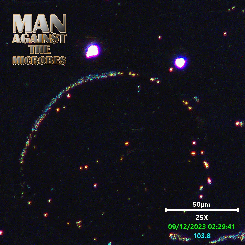 This post is becoming too long to email. So i will skip endless images for now and show that these dots can be in many other physical states. This dot pattern can often be seen slightly differently in the gel phase, specially in bright field. The guys at ‘Mira al microscopio’ where they show contaminated product images will love this, they see the pattern all the time. Ive been seeing these and far more detailed ones for 3 years without having a clue that they were either dots or dots that turned to a gel phase.
