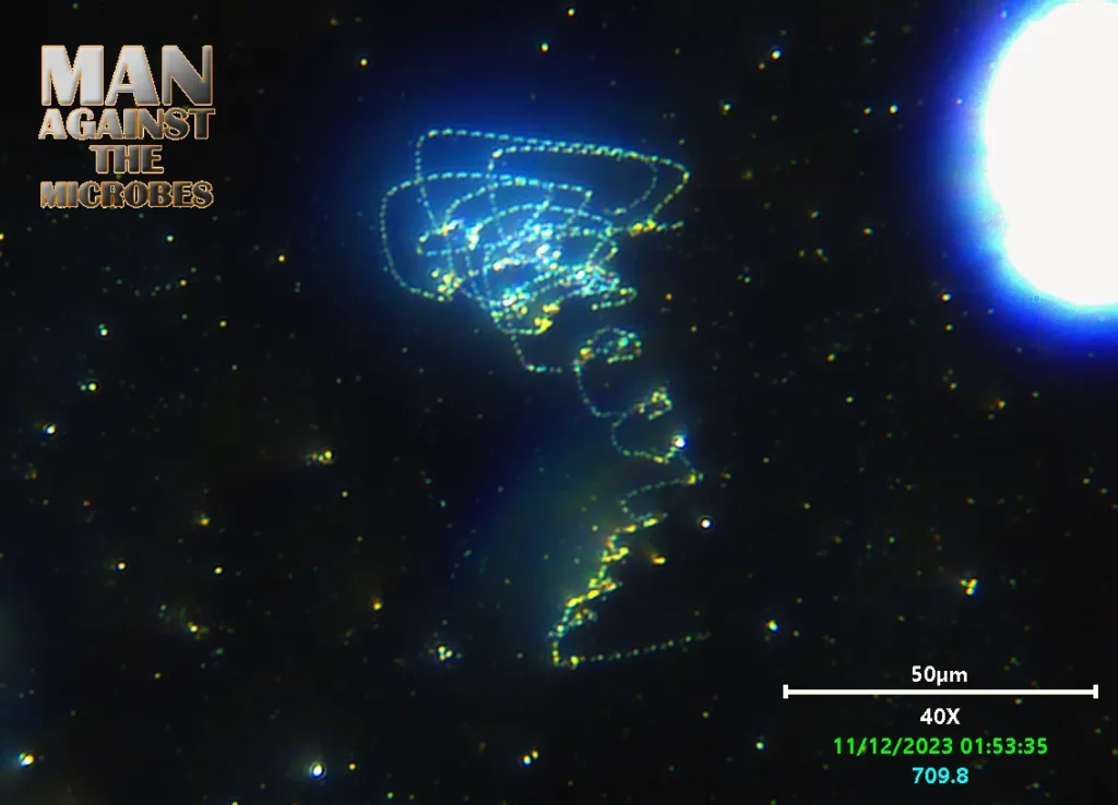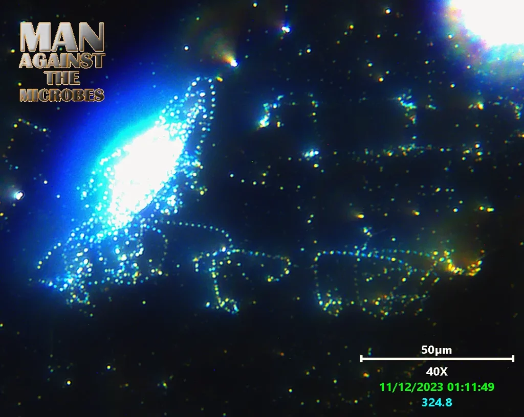 There are disorganization lawns of the dots after leaving the urine sample under cover slip for 30 mins plus, not just dotted strands appearing. These dots may well be a very advanced Q-dot, or they may be something else similar. But a Q-dot is very possible since there are ways to synthesize Q-dots via protocells, Microcapsules, and by other means. In other posts we will show the dots being synthesized in cells that could well be a protocell or Microcapsule. These are also seen in the blood, and Dr Len Ber shows images from vaccine samples mixed with blood.