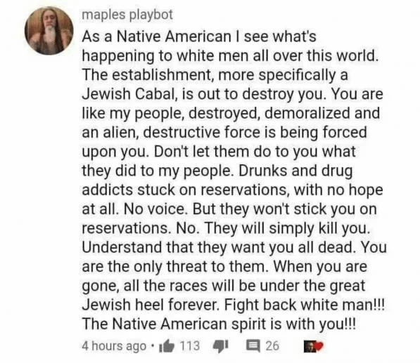 A brave Native American issues a grim warning to her White brothers and sisters.