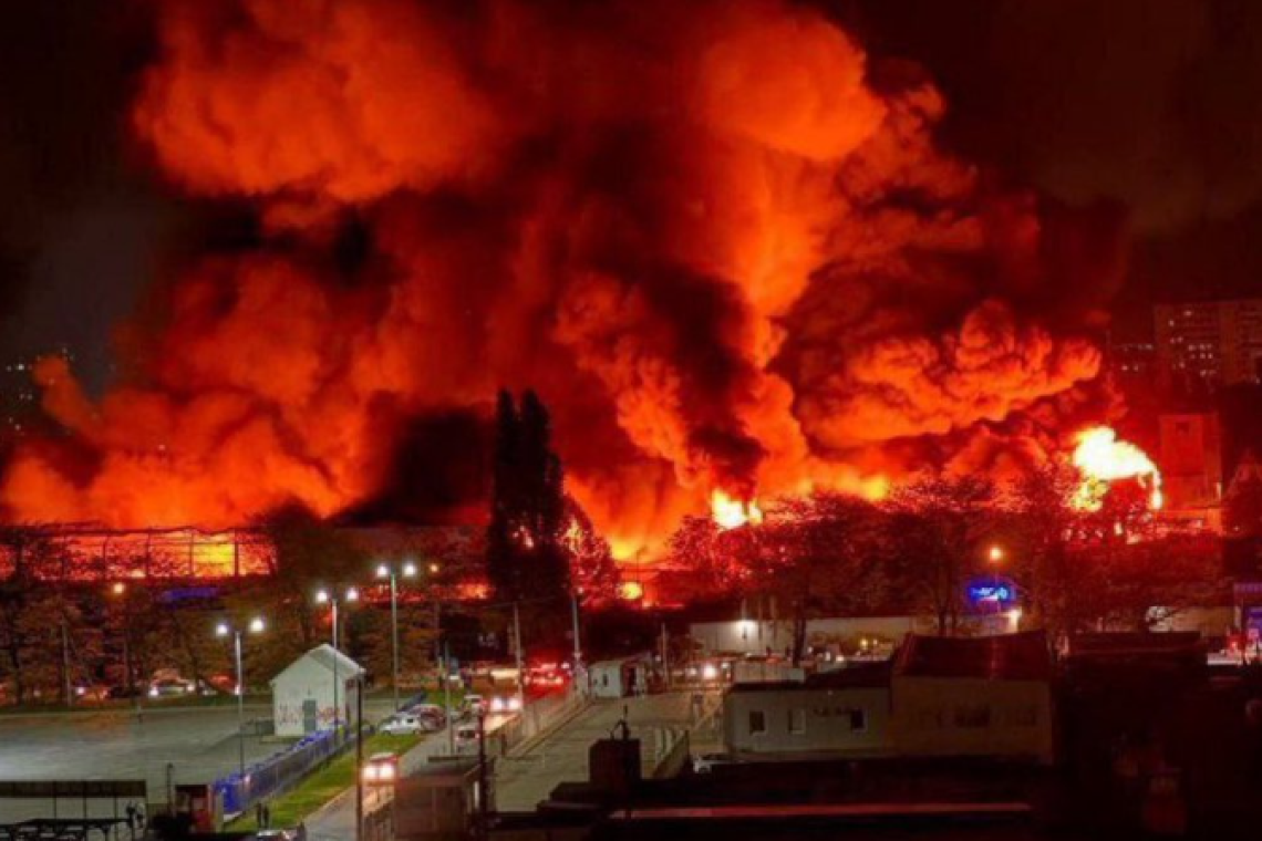 The Novaya Pochta warehouse in Odessa is seen burning in the image above, after the missiles struck.