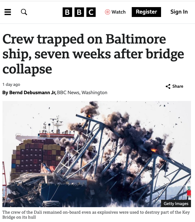 …while the the controlled demolition crews are blowing up the bridge tangled around the Dali container ship