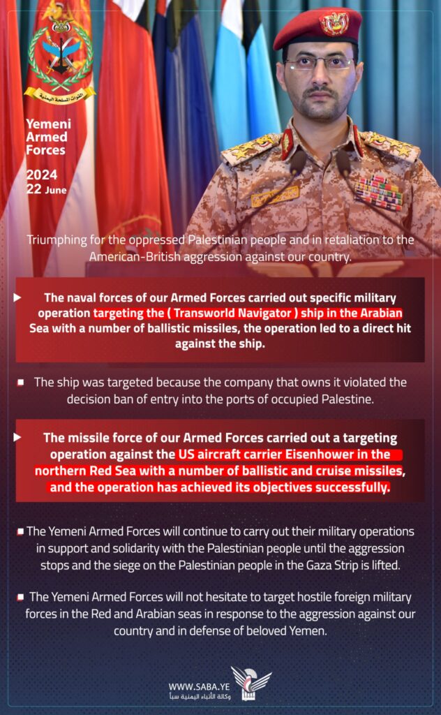 YEMEN CLAIMS IT HAS SUCCESSFULLY STRUCK THE USS EISENHOWER IN NORTHERN RED SEA (Updated 2:59 PM EDT on 6/22/24