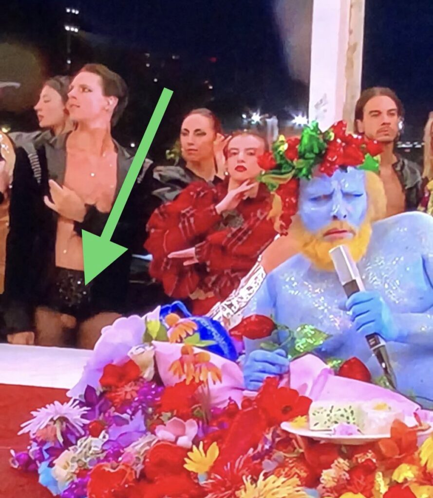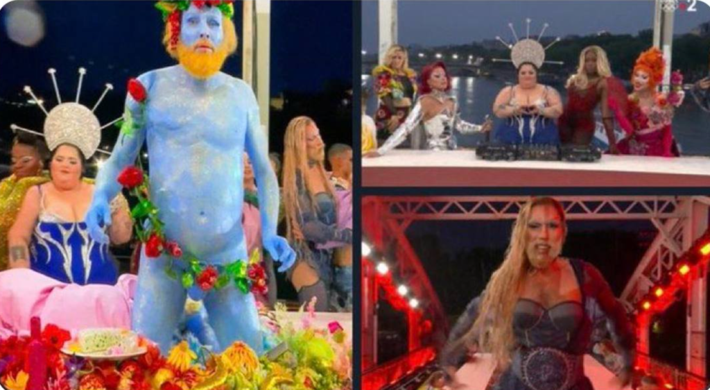 Apparently, the blue man is supposed to be God. The fat woman behind him to the left is supposed to be Jesus. The top-right image is the “Last Supper” full of Drag Queens, the Bottom right is a bearded “woman” dancing and below, to the left side of the “Last Supper” are more degenerates, including a man with his ball sack hanging out in public.