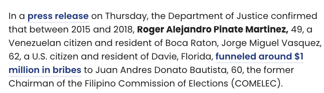 “These bribes were allegedly paid to obtain and retain business related to providing voting machines and election services for the 2016 Philippine elections and to secure payments on the contracts, including the release of value added tax payments,” according to a press release from the US Department of Justice.