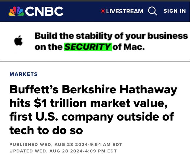 ___ https://www.cnbc.com/2024/08/28/buffetts-berkshire-hathaway-hits-1-trillion-market-value-first-us-company-outside-of-tech-to-do-so.html