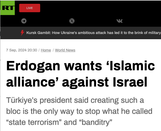Turkey’s President Erdogan wants ‘Islamic alliance’ against Israel to stop “state terrorism” and “banditry”