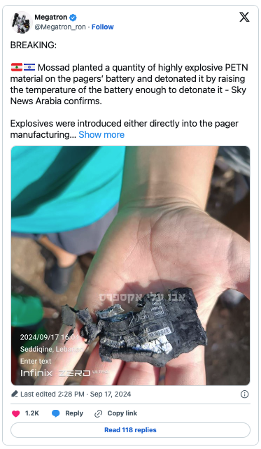Explosives were introduced either directly into the pager manufacturing… pic.twitter.com/gwiV0lyWDr
