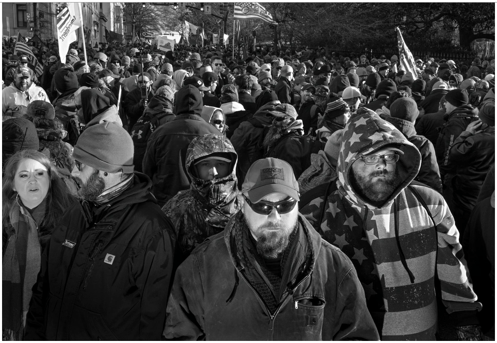 Rhodes was there, along with some other Oath Keepers. On a Facebook page called “The Militias March on Richmond,” an organizer of the event declared that he’d sworn an oath to defend the Constitution against enemies foreign and domestic when he joined the military and the police—and now a militia. He called Virginia the scene of “a great awakening.”Virginia was a microcosm of the far right’s fears for the 2020 election: a swing to the left followed by an immediate push for gun control that would be the starting point for a wider assault on American freedoms. Many current and former Oath Keepers told me that gun rights were what had inspired them to join the group; some dismissed the more lurid parts of Rhodes’s list of 10 orders to defy.David Hines, a conservative writer, has called guns the right’s most successful organizing platform. The issue demands local involvement, to closely track not just federal but state and municipal laws and politics. Guns are also social. To shoot them, you’ll likely head to a range, and to buy them, you’ll likely visit a store or a gun show where you’ll find people who share your mindset. “Guns,” Hines writes, “are onramps to activism.”I couldn’t find Rhodes or any other Oath Keepers as I squeezed through the crowd. Instead I met protesters like Daniel McClure, a 23-year-old working as a contractor for the Tennessee Valley Authority, who stood with his dad near the capitol lawn. He was pleased by the turnout, he told me, but also willing to abandon peaceful protest if democracy stopped working. His idea of responsible citizenship meant keeping the prospect of insurrection in reserve. He repeated a maxim I heard often: Gun rights are the rights that protect all the rest. “If speaking softly won’t work,” he said, lifting the butt of his rifle, “the stick will come.”Before the rally, the FBI had arrested alleged white supremacists who planned to fire on the crowd to incite a wider conflict, according to prosecutors, and social media had been filled with not-so-veiled threats against Virginia’s Democratic lawmakers. I was struck by how commonplace talk of violence had become. Liberals had been invoking it, too. “Your little AR-15 isn’t going to do shit to protect you from the government—who has tanks and nuclear weapons. That is a pathetic fantasy,” the top aide to a Virginia lawmaker had written in a viral tweet a few months earlier.In the crowd, I noticed men muttering into walkie-talkies, their eyes hidden behind wraparound shades. To me they had the aspect of children playing at war, only their guns were real. There was a loud bang, and I whirled around as hands moved toward triggers. But someone had only knocked a metal sign onto the pavement.The rally ended peacefully. Protesters picked up trash as the men with walkie-talkies faded into the city.