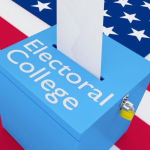 3D illustration of “Electoral College” script on a ballot box with US flag as a background.