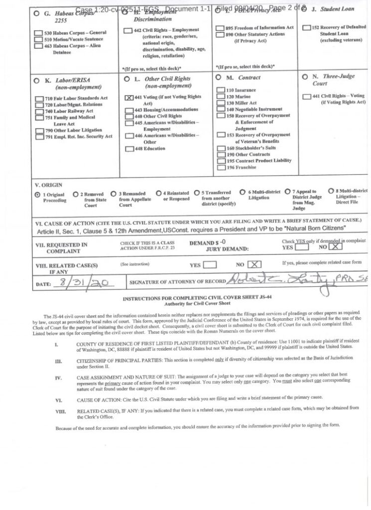 The cover sheet, consisting of two pages and completed on August 31, indicates that Laity cited as the suit’s “Cause of Action,” “Article II, Sec. 1, Clause 5 & 12th Amendment, USConst. requires a President and VP to be ‘Natural Born Citizens’”.