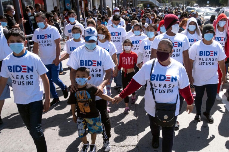 Migrants hold a demonstration demanding clearer United States migration policies, at San Ysidro crossing port in Tijuana, Baja California state, Mexico on March 2, 2021. – Thousands of migrants out of the Migrant Protection Protocol (MPP) program are stranded along the US-Mexico border without knowing when or how they will be able to start their migratory process with US authorities. (Photo by Guillermo Arias / AFP) (Photo by GUILLERMO ARIAS/AFP via Getty Images)