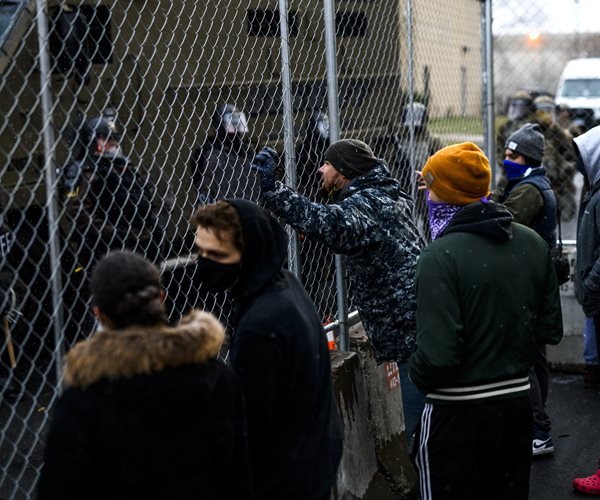 Protesters confront law enforcement outside the Brooklyn Center police headquarters on Tuesday in Brooklyn Center, Minnesota. (Stephen Maturen/Getty Images)