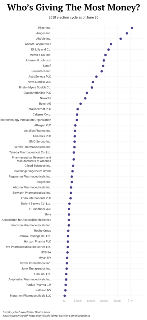 Campaign contributions tell only part of the story. Drugmakers also spend millions of dollars lobbying members of Congress directly and give to patient advocacy groups, which provide patients to testify on Capitol Hill and organize social media campaigns on drugmakers’ behalf.