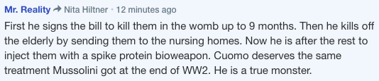 “First he signs the bill to kill them in the womb up to 9 months. Then he kills off the elderly by sending them to the nursing homes. Now he is after the rest to inject them with a spike protein bioweapon. Cuomo deserves the same treatment Mussolini got at the end of WW2. He is a true monster.