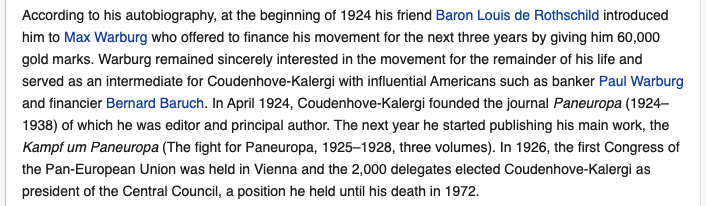 “According to his autobiography, at the beginning of 1924 his friend Baron Louis de Rothschild introduced him to Max Warburg who offered to finance his movement for the next three years by giving him 60,000 gold marks. Warburg remained sincerely interested in the movement for the remainder of his life and served as an intermediate for Coudenhove-Kalergi with influential Americans such as banker Paul Warburg and financier Bernard Baruch. In April 1924, Coudenhove-Kalergi founded the journal Paneuropa (1924–1938) of which he was editor and principal author. The next year he started publishing his main work, the Kampf um Paneuropa (The fight for Paneuropa, 1925–1928, three volumes). In 1926, the first Congress of the Pan-European Union was held in Vienna and the 2,000 delegates elected Coudenhove-Kalergi as president of the Central Council, a position he held until his death in 1972.”