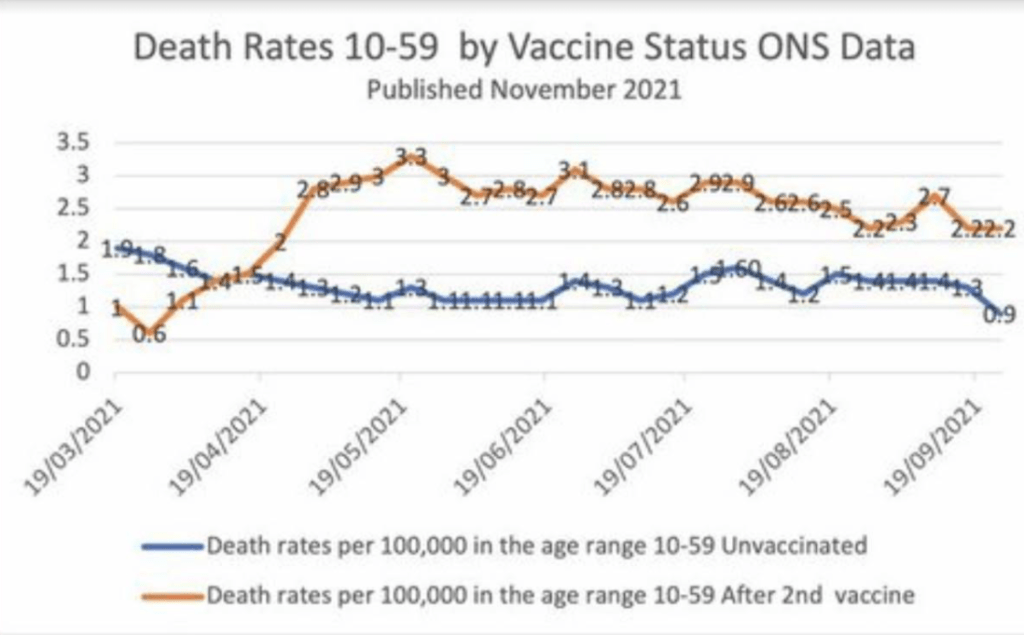 In England, vaccinated adults under 60 have been dying at twice the rate of unvaccinated people for the past six months. This chart is based on weekly data from the British government: