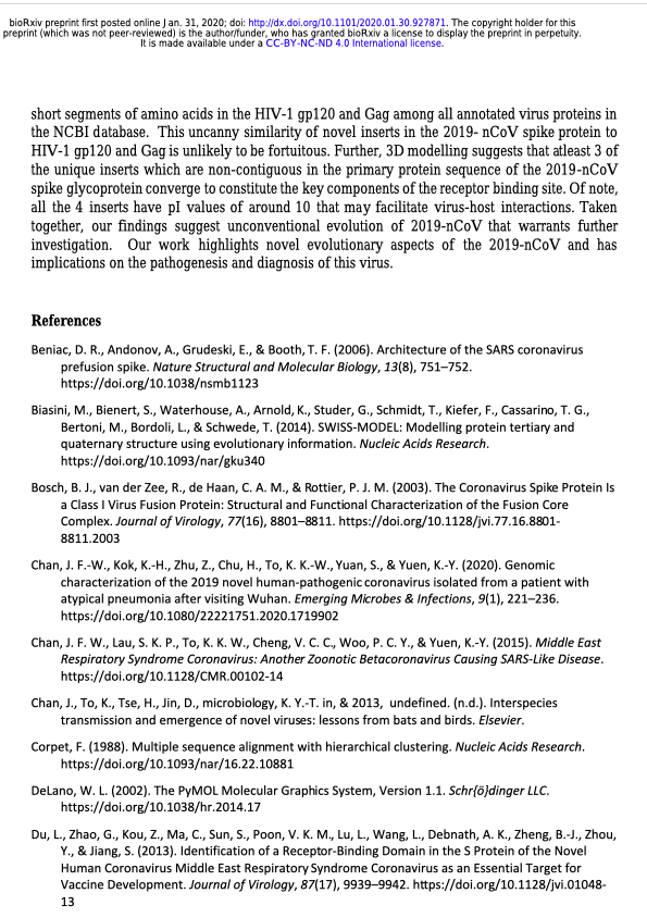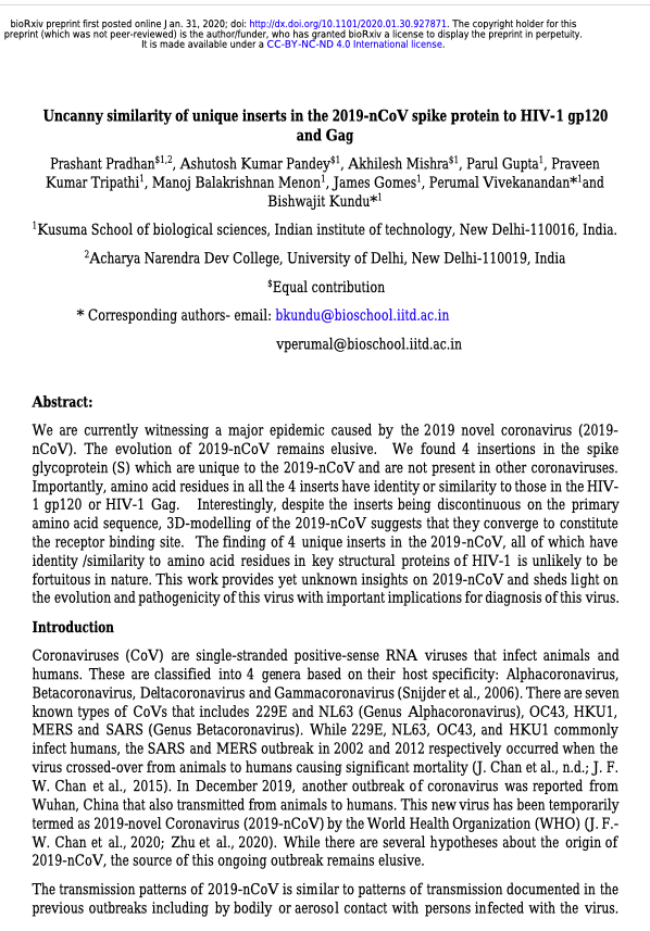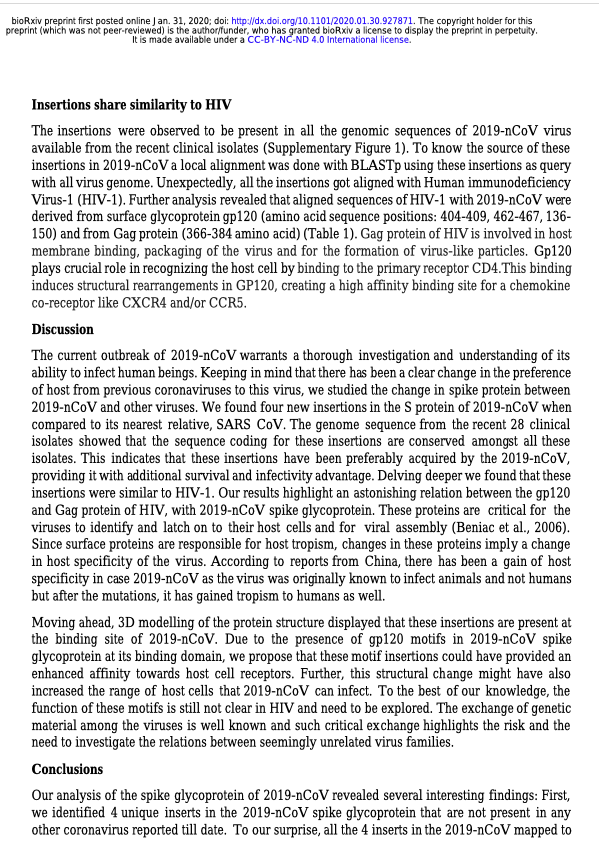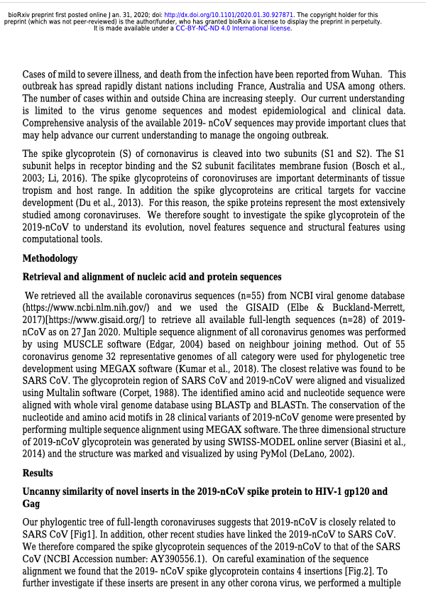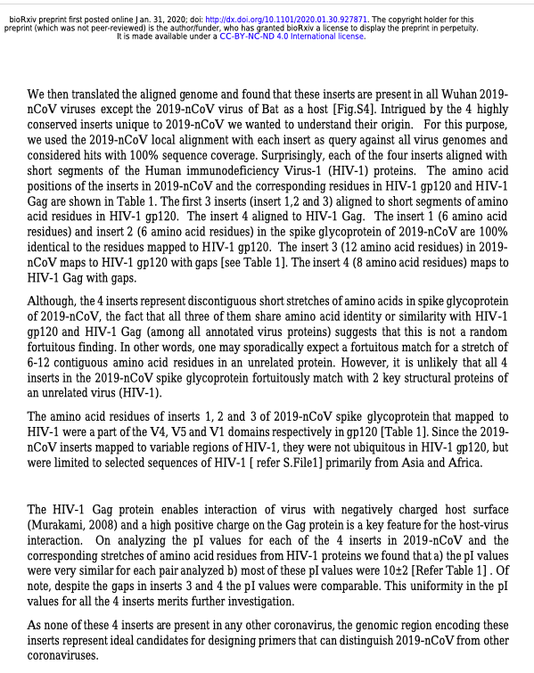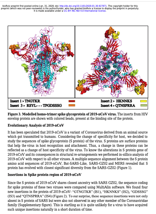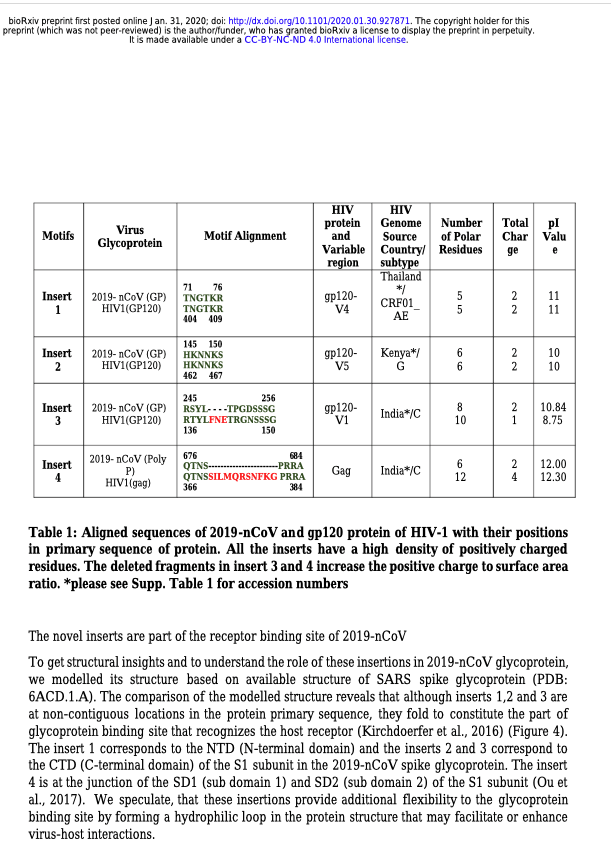Uncanny similarity of unique inserts in the 2019-nCoV spike protein to HIV-1 gp120 and Gag